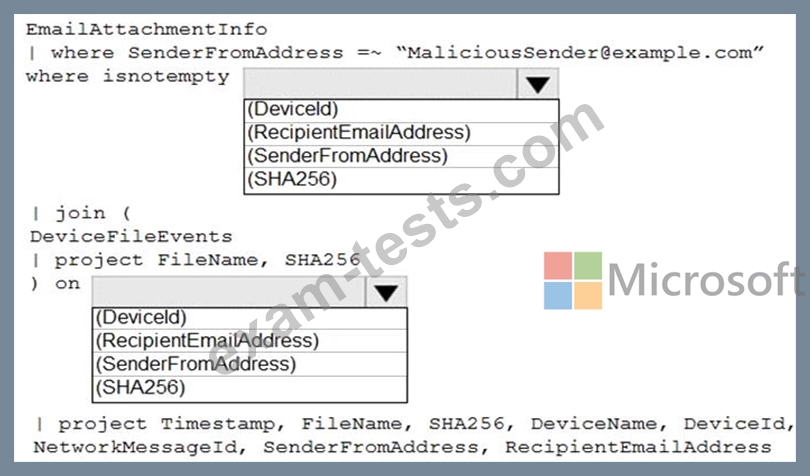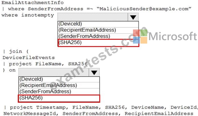 You need to identify all the devices that contain files in emails sent by a known malicious email sender. The query will be based on the match of the SHA256 hash.