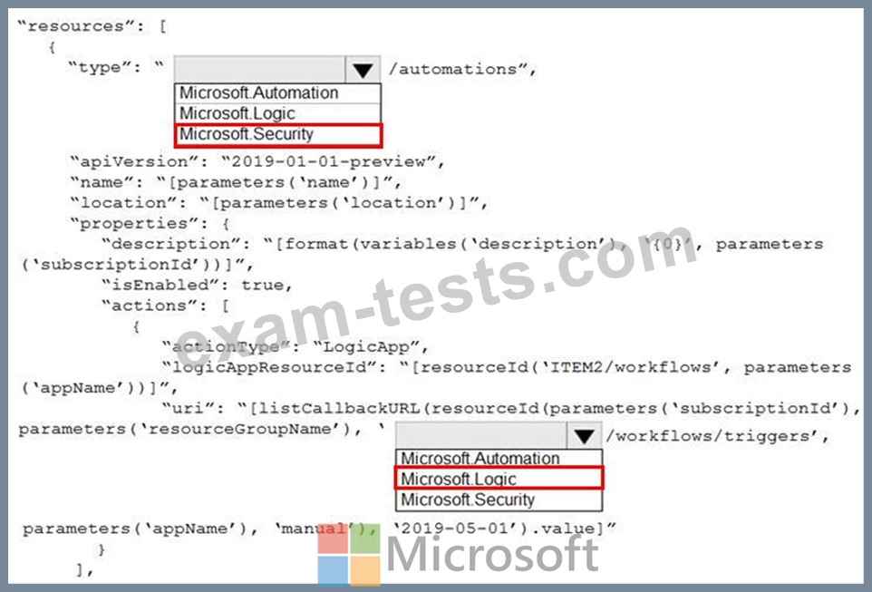You need to use an Azure Resource Manager template to create a workflow automation that will trigger an automatic remediation when specific security alerts are received by Azure Security Center.