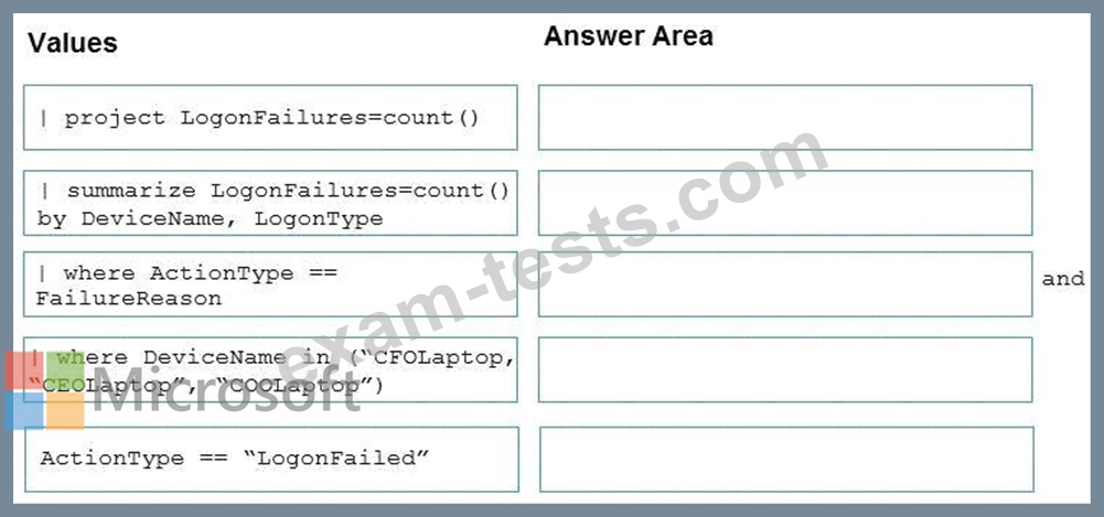 You need to create an advanced hunting query to detect failed sign-in authentications on three devices named CFOLaptop, CEOLaptop, and COOLaptop.