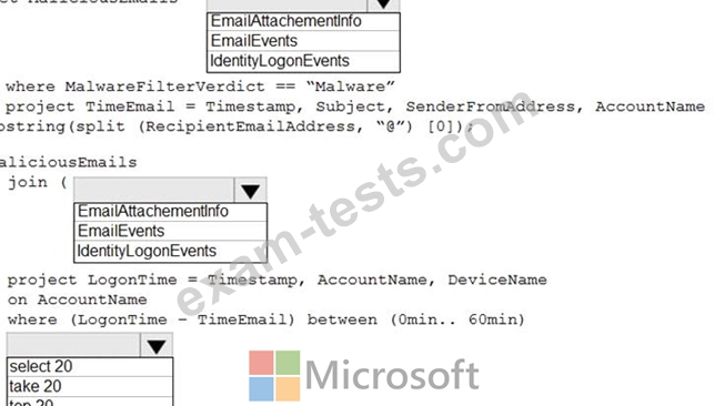 You need to create an advanced hunting query in Microsoft 365 Defender to identify whether the accounts of the email recipients were compromised. The query must return the most recent 20 sign-ins performed by the recipients within an hour of receiving the known malicious email.