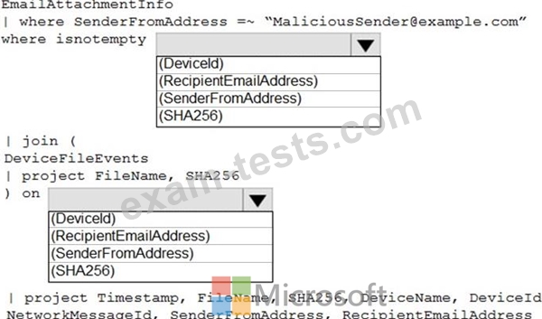 You need to identify all the devices that contain files in emails sent by a known malicious email sender. The query will be based on the match of the SHA256 hash.