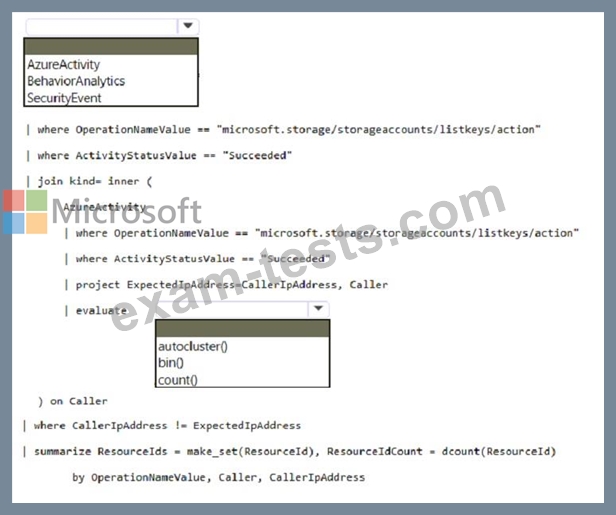 You need to create a hunting query to identify users that list storage keys of multiple Azure Storage accounts. The solution must exclude users that list storage keys for a single storage account.