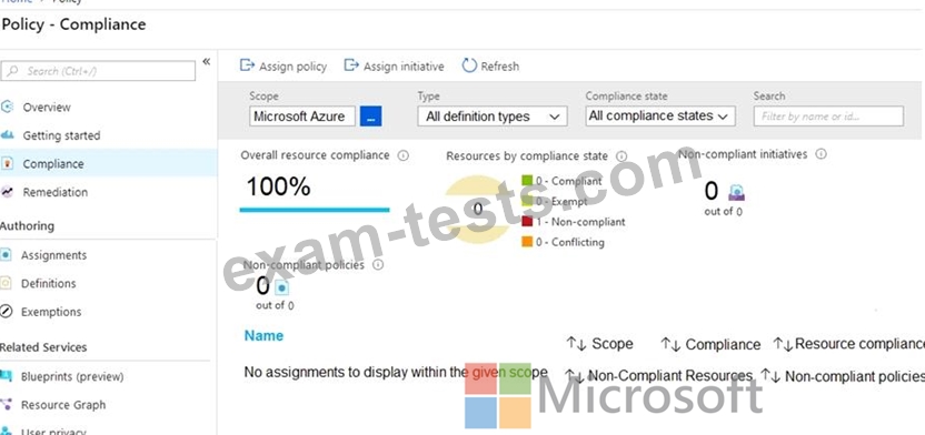 Azure Policy assignments are configured as shown in the Policies exhibit. (Click the Policies tab.)