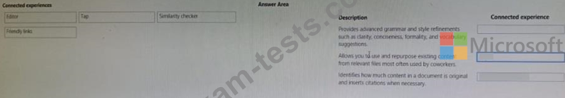 Which connected experiences should you describe? To answer, drag the appropriate connected experiences to the correct description. Each connected experience may be used once, more than once, or not at all. You may need to drag the split between panes or scroll to view content.