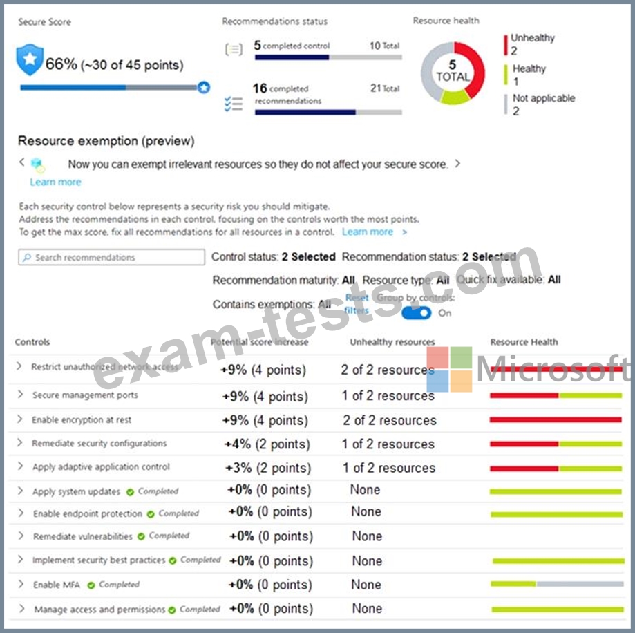 The secure score in Azure Security Center is shown in the Security Center exhibit. (Click the Security Center tab.)