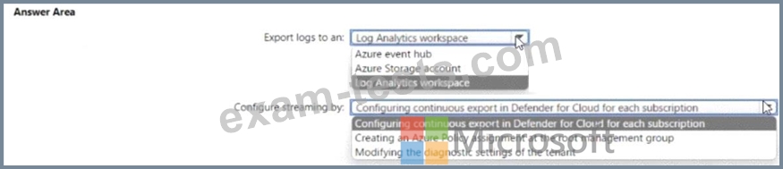 You have 100 Azure subscriptions that have enhanced security features m Microsoft Defender for Cloud enabled. All the subscriptions are linked to a single Azure AD tenant. You need to stream the Defender for Cloud togs to a syslog server. The solution must minimize administrative effort What should you do? To answer, select the appropriate options in the answer area NOTE: Each correct selection is worth one point