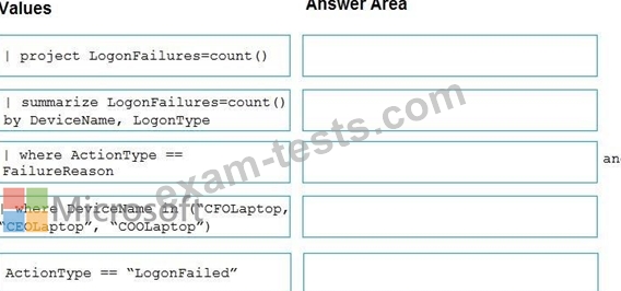 You need to create an advanced hunting query to detect failed sign-in authentications on three devices named CFOLaptop, CEOLaptop, and COOLaptop.