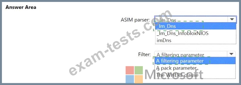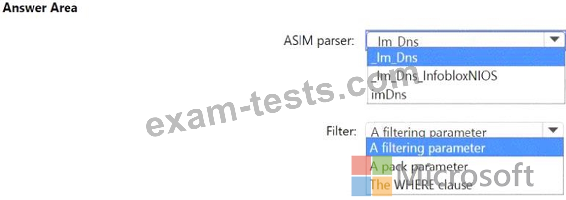 You need to implement the ASIM query for DNS requests. The solution must meet the Microsoft Sentinel requirements. How should you configure the query? To answer, select the appropriate options in the answer area. NOTE: Each correct selection is worth one point.