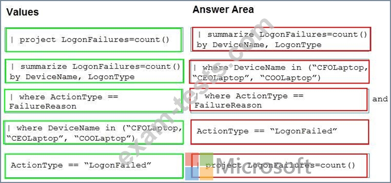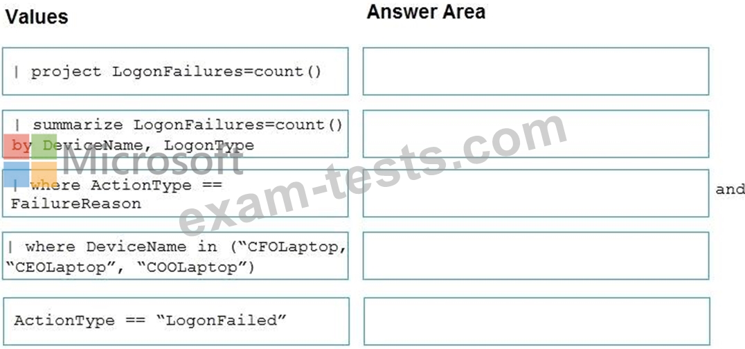 You need to create an advanced hunting query to detect failed sign-in authentications on three devices named CFOLaptop, CEOLaptop, and COOLaptop.
