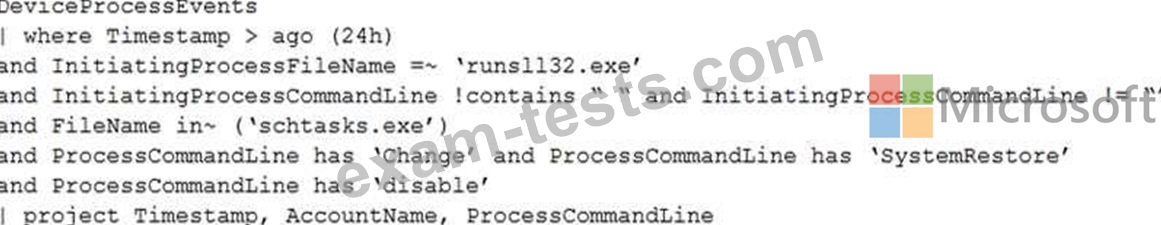 You need to receive an alert when any process disables System Restore on a device managed by Microsoft Defender during the last 24 hours.