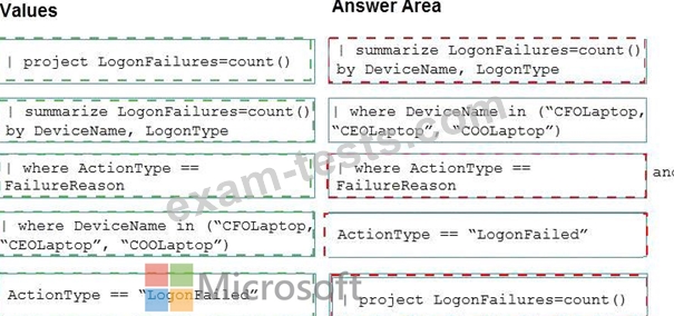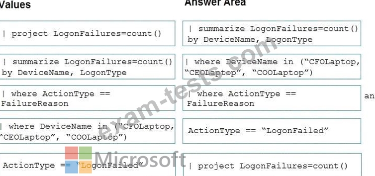 You need to create an advanced hunting query to detect failed sign-in authentications on three devices named CFOLaptop, CEOLaptop, and COOLaptop.