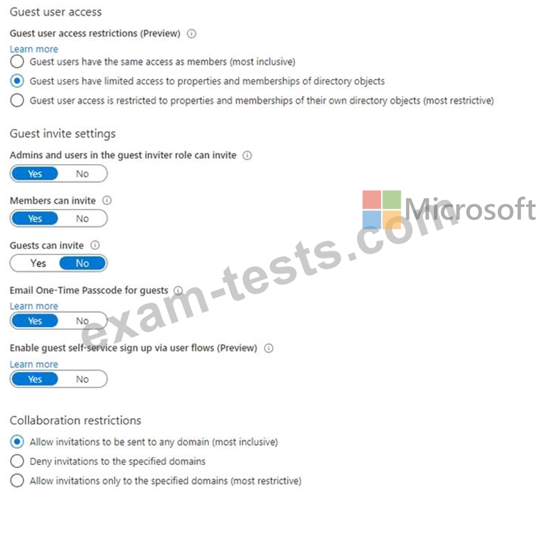 You have a Microsoft 365 tenant that uses the domain named fabrikam.com. The Guest invite settings for Azure Active Directory (Azure AD) are configured as shown in the exhibit. (Click the Exhibit tab.)