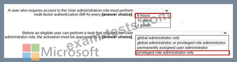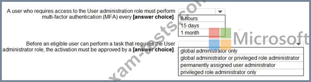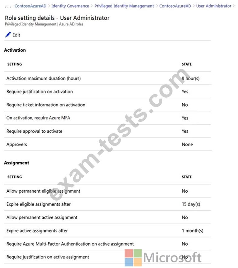 You have an Azure Active Directory (Azure AD) tenant that contains Azure AD Privileged Identity Management (PIM) role settings for the User administrator role as shown in the following exhibit.