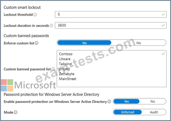 You configure Azure Active Directory (Azure AD) Password Protection as shown in the exhibit. (Click the Exhibit tab.)