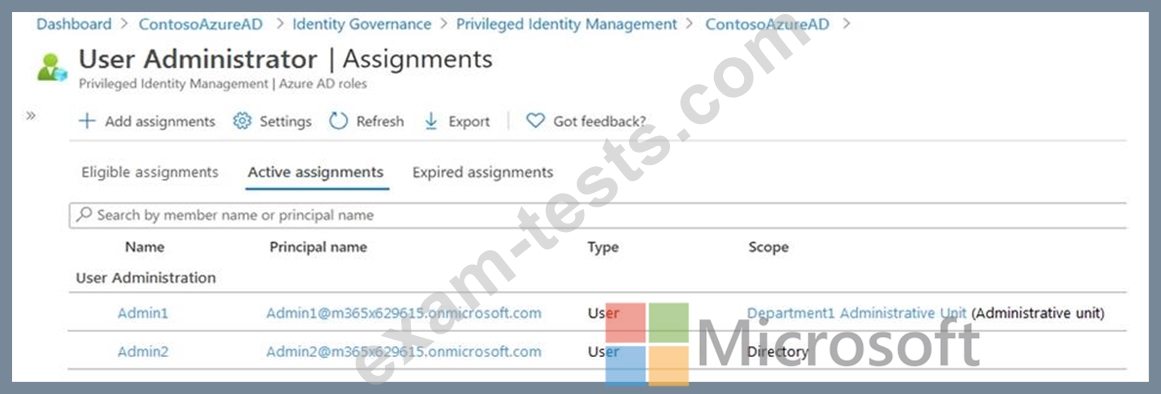 Department1 has the user administrator assignments shown in the Assignments exhibit. (Click the Assignments tab.)