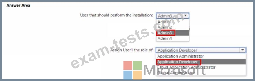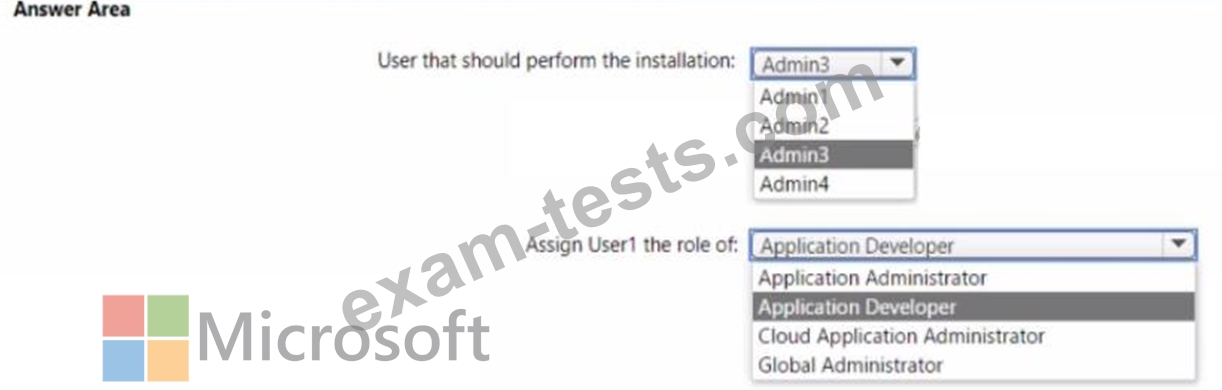 Which user should perform the installation, and which role should you assign to Users1? To answer, select the appropriate options in the answer area.