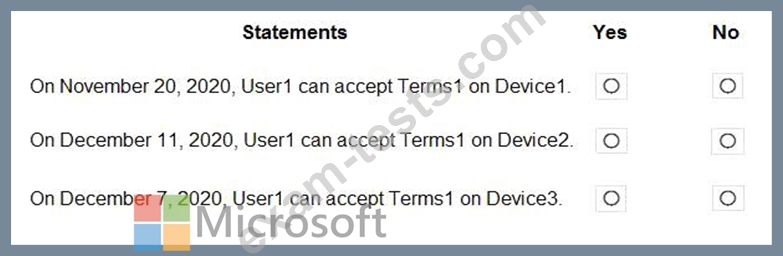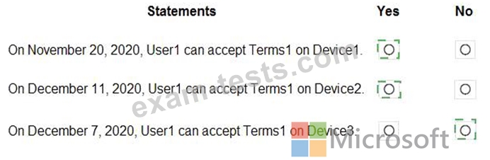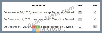 On November 5, 2020, you create and enforce terms of use in contoso.com that has the following settings: