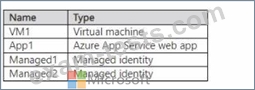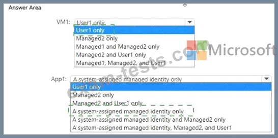 Which identities can you add to VM1 and App1? To answer, select the appropriate options in the answer area.