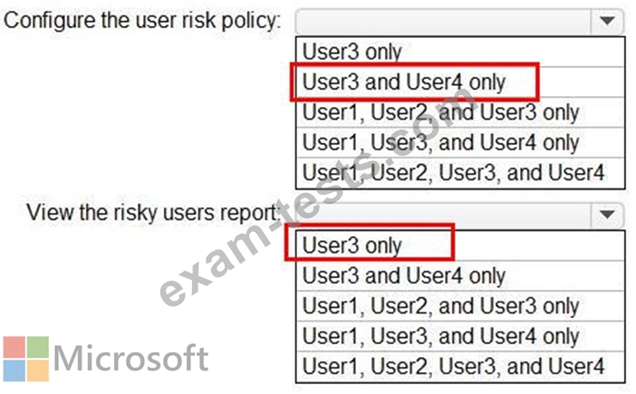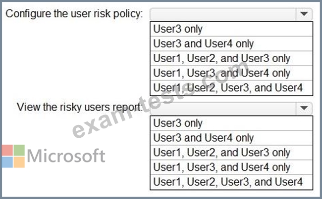 Which users can configure the user risk policy, and which users can view the risky users report? To answer, select the appropriate options in the answer area.