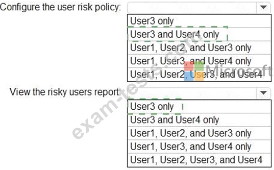 Which users can configure the user risk policy, and which users can view the risky users report? To answer, select the appropriate options in the answer area.