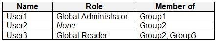 You have a Microsoft 365 E5 subscription that contains three groups named Group1, Group2, and Group3, and the users shown in the following table.