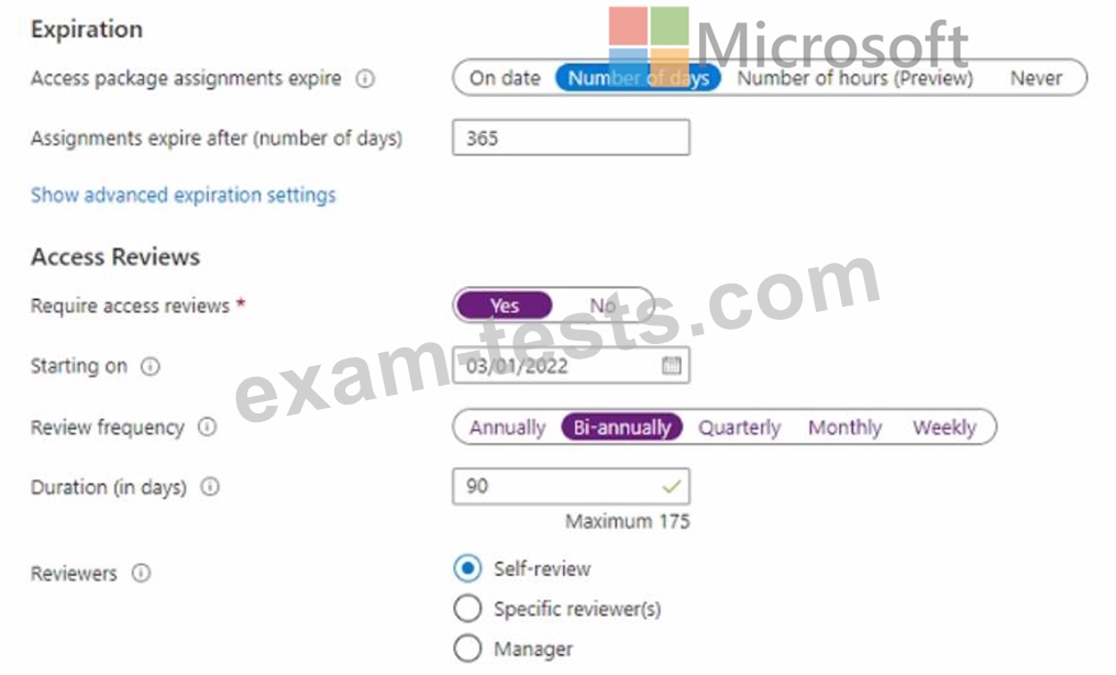 * Fabrikam users must have access to the marketing department's SharePoint site for a maximum of 90 days.
