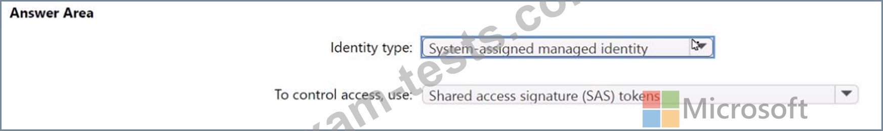 Which type of identity should you recommend, and what should you recommend using to control access to the storage accounts? To answer, select the appropriate options in the answer area.