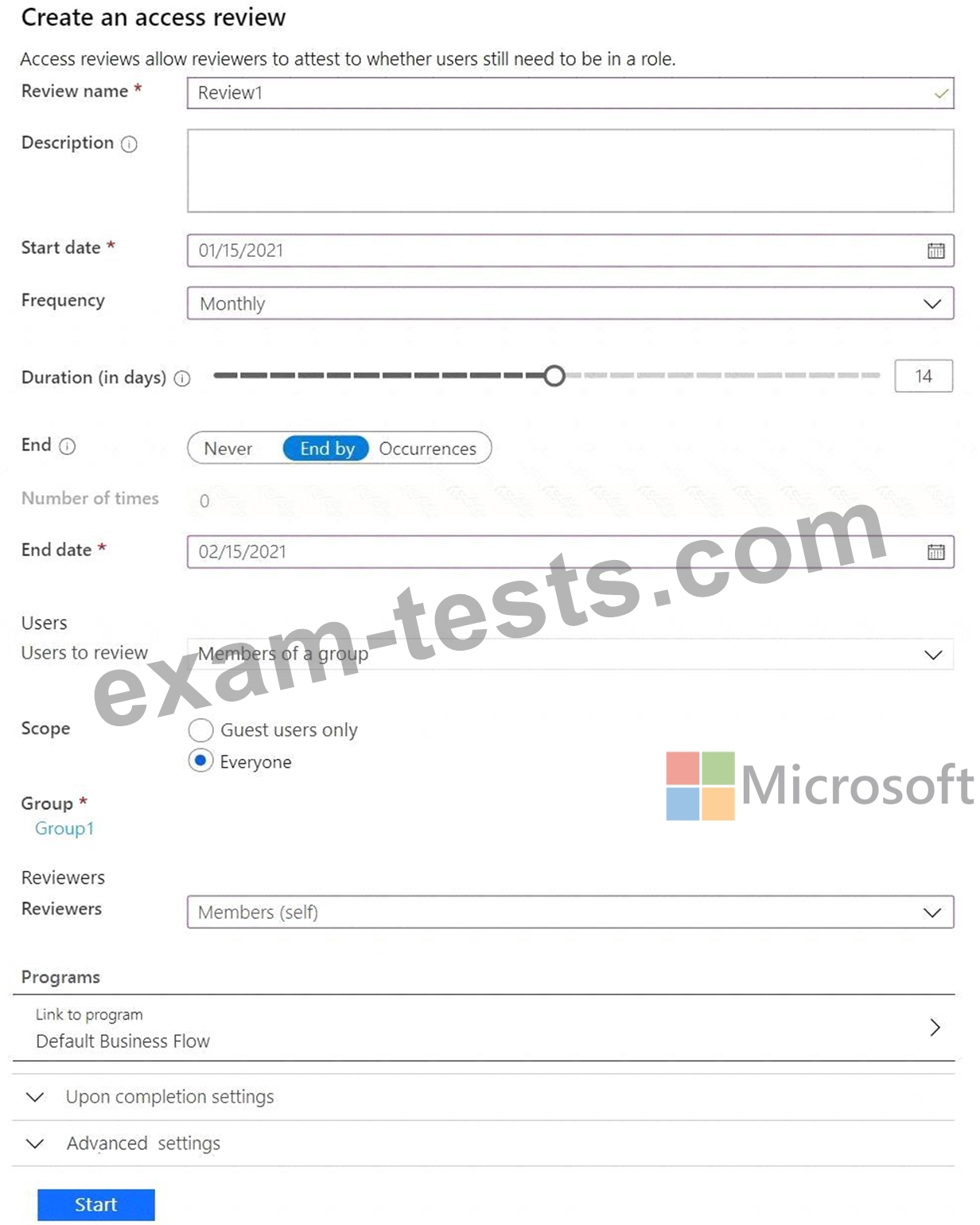 On January 15, 2021, you create an access review as shown in the exhibit. (Click the Exhibit tab.)