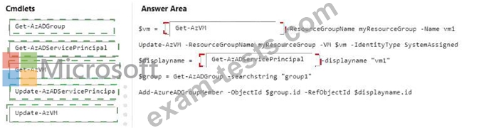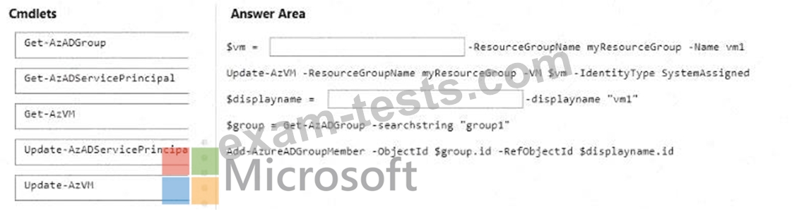 How should you complete the PowerShell script? To answer, drag the appropriate cmdlets to the correct targets. Each cmdlet may be used once, more than once, or not at all. You may need to drag the split bar between panes or scroll to view content.