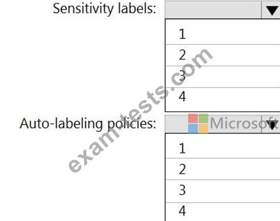 What is the minimum number of sensitivity labels and auto-labeling policies you should create? To answer, select the appropriate options in the answer area.