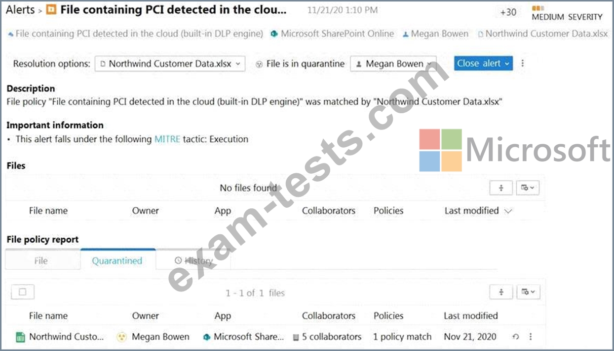 From the Cloud App Security portal, you discover the alert shown in the exhibit.