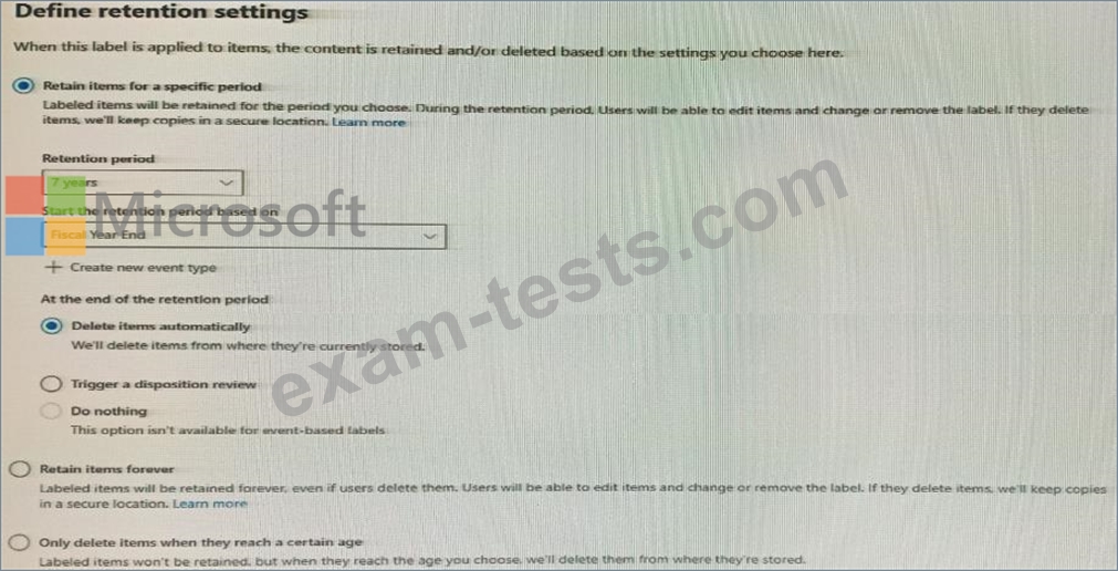 You have the retention label policy shown in the Policy exhibit. (Click the Policy tab.)