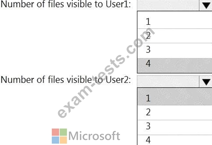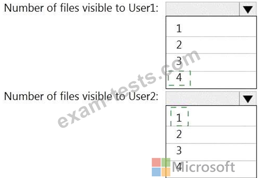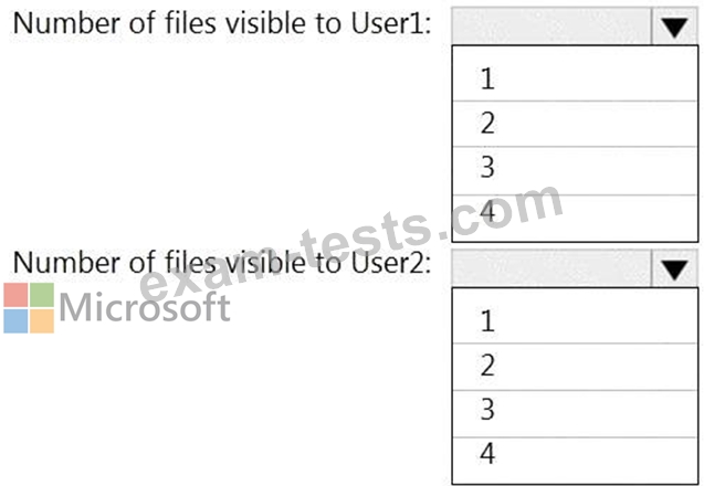 How many files in Site2 will be visible to User1 and User2 after you turn on DLPpolicy1? To answer, select the appropriate options in the answer area.