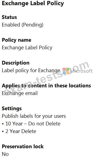 A Microsoft 365 retention label policy is shown in the Label Policy exhibit.