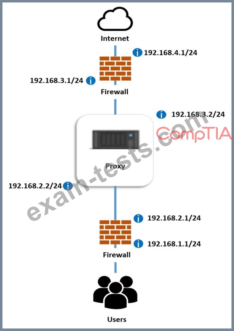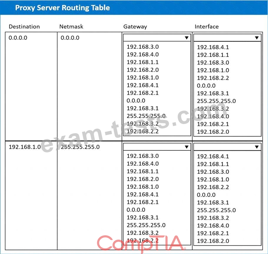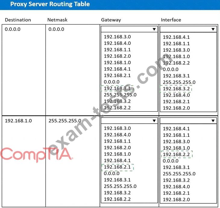 A systems administrator deployed a new web proxy server onto the network. The proxy server has two interfaces: the first is connected to an internal corporate firewall, and the second is connected to an internet-facing firewall. Many users at the company are reporting they are unable to access the Internet since the new proxy was introduced. Analyze the network diagram and the proxy server's host routing table to resolve the Internet connectivity issues.