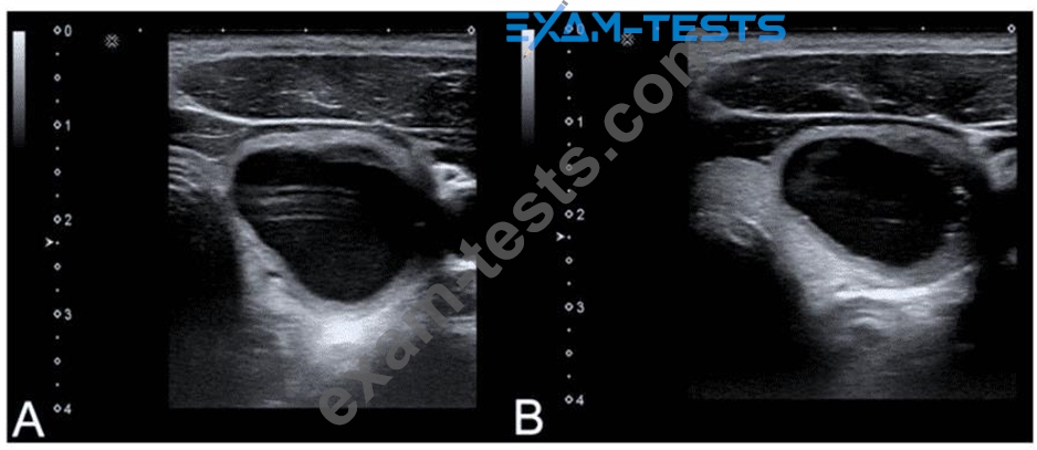 Which adjustment will reduce the artifact in the cystic lesion in image A resulting in image B?