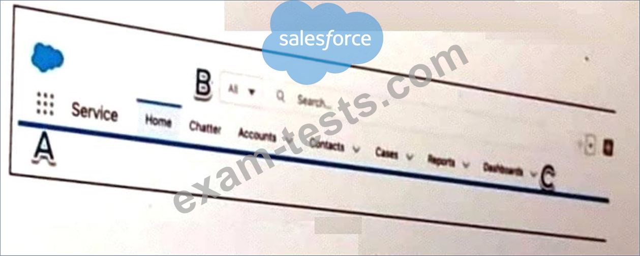 Refer to the screenshot that shows the top portion of the Salesforce Service app with areas labeled A, B, and C.