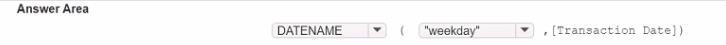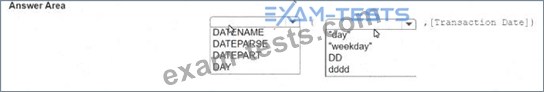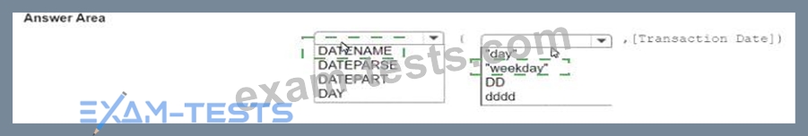 You have the following dataset. You need to generate the results in the Day field. How should you complete the formula? (Use the dropdowns in the Answer Area to select the correct options to complete the formula.)