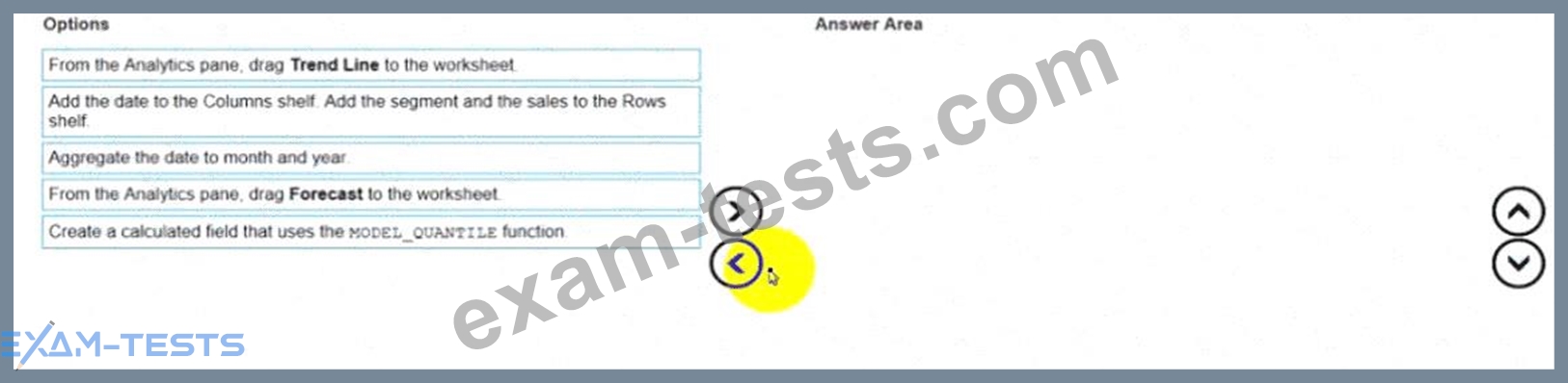 Explanation: The correct order of the three actions is: * Add the date to the Columns shelf. Add the segment and the sales to the Rows shelf. * Aggregate the date to month and year. * From the Analytics pane, drag Forecast to the worksheet. The first action is to add the date to the Columns shelf and the segment and the sales to the Rows shelf. This will create a line chart that shows the daily sales by segment over time. You can use the Show Me menu to choose a line chart if it is not selected by default. The second action is to aggregate the date to month and year. This will group the daily sales into monthly sales and show the yearly trend. You can right-click on the date field on the Columns shelf and select Month (January 2017) from the menu. You can also drag Year from the Dimensions pane to the Columns shelf before or after Month. The third action is to drag Forecast from the Analytics pane to the worksheet. This will add a forecast that predicts future sales by segment based on historical trends. You can customize the forecast by clicking on it and using the options on the Marks card. The other options are not relevant for this scenario. Adding a trend line would show a linear or nonlinear relationship between two measures, but not a prediction of future values. Creating a calculated field that uses the model quantile function would return a value from a statistical model based on a given quantile, but not a forecast. References: https://help.tableau.com/current/pro/desktop/en-us/analytics.htm https://help.tableau.com/current /pro/desktop/en-us/buildmanual_shelves.htm https://help.tableau.com/current/pro/desktop/en-us/dates.htm https://help.tableau.com/current/pro/desktop/en-us/analytics_forecast.htm https://help.tableau.com/current/pro /desktop/en-us/functions_functions_statistical.htm#MODEL_QUANTILE