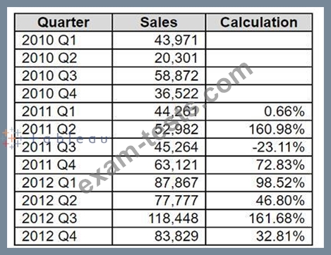 You have the following dataset. Which formula calculates the percent difference in sales relative to the same quarter the previous year as shown in the Calculation field?