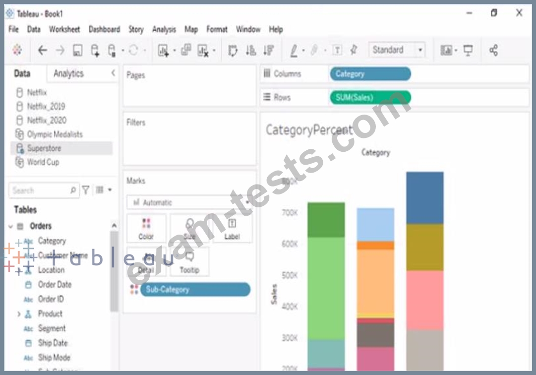 Modify the bar chart show the percentage of sales for each Subcategory within every Category. The total percentage for every Category must be 100%.