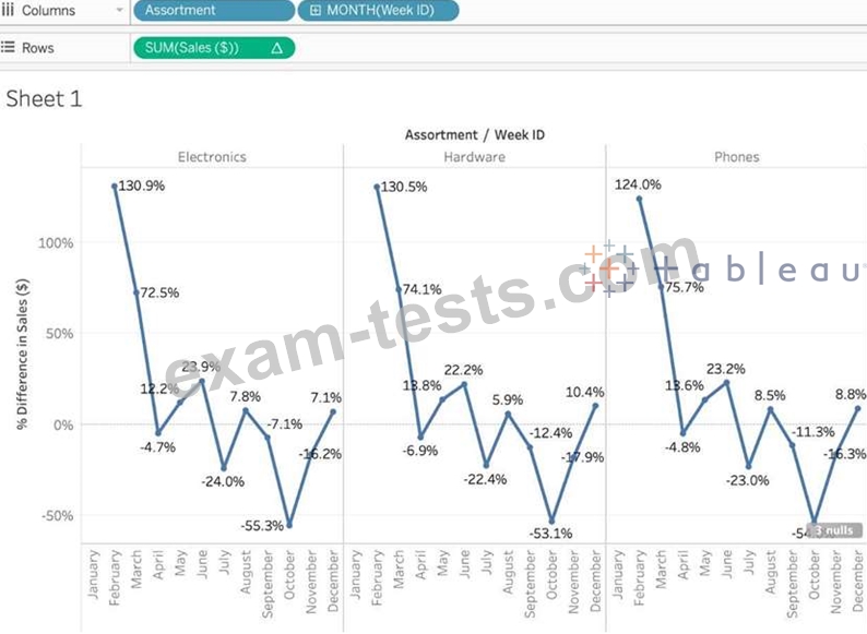 Using the Time Series Table, create a Line chart showing the Monthly Year over Year Growth for the Sales, broken down by Assortment. For the Electronics assortment, which Month had the most NEGATIVE value of Year over Year Growth?