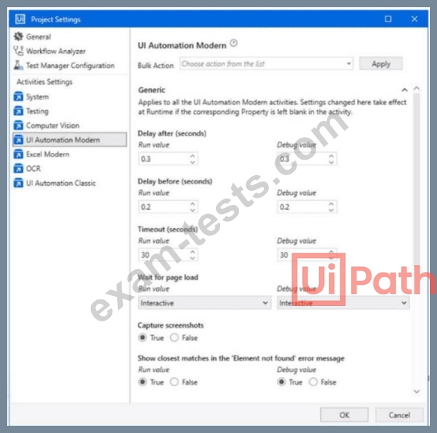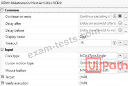 Comprehensive and Detailed Explanation From Exact Extract: In UiPath, when executing an activity such asClick, the timeout behavior is determined as follows: * If the Timeout property in the activity is set, that value is used. * If the Timeout is left blank, the system uses thedefault from Project SettingsunderUI Automation Modern # Timeout. In this case (based on the second image): * TheClick activity explicitly has Timeout set to 15 seconds. * Therefore, this activity willoverridethe project-level default timeout (which is 30 seconds as seen in the first image). Rule Applied: Activity Timeout > Project Settings Timeout (if defined) Hence, if thetarget element is not found, UiPath willwait for 15 seconds, as specified in the activity's Timeout field, before throwing an error. * UiPath Documentation Reference:TimeoutMS Property - UiPath Docs