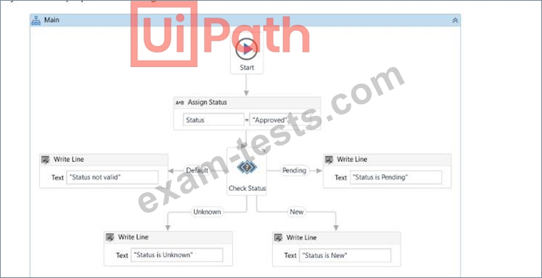 From the provided workflow: The Assign Status activity sets the variable Status to the value "Approved". The Check Status activity evaluates the value of Status against defined conditions. It has branches for "Pending", "New", and "Unknown". The "Default" branch is triggered if none of these conditions match the value of Status. Since "Approved" does not match "Pending", "New", or "Unknown", the Default branch will execute. The Write Line activity in the Default branch outputs "Status not valid." to the Output panel.