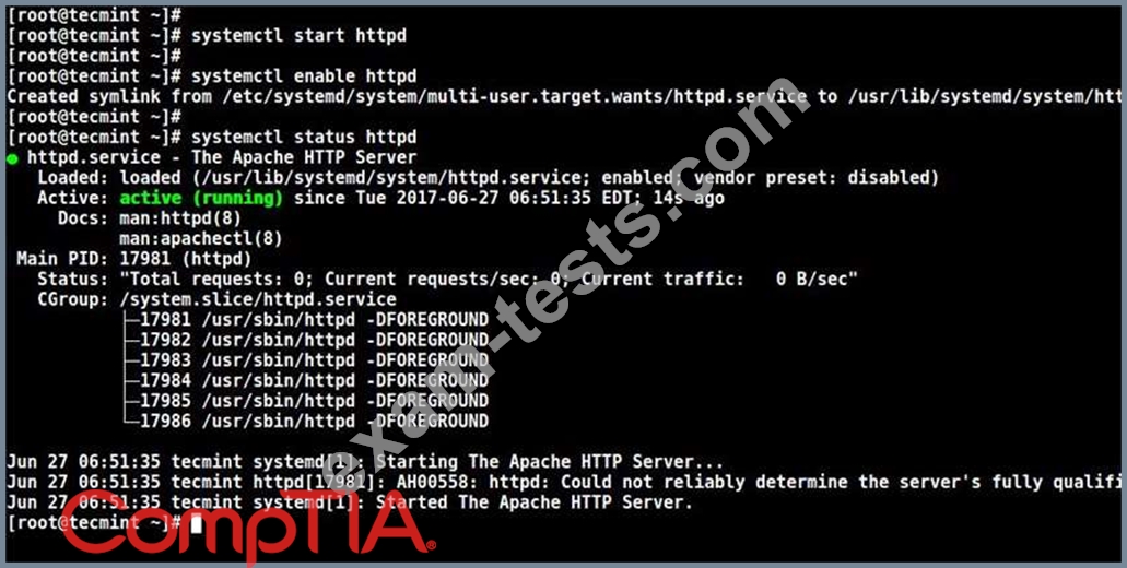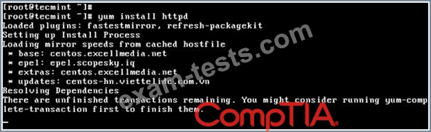 A junior system administrator had trouble installing and running an Apache web server on a Linux server. You have been tasked with installing the Apache web server on the Linux server and resolving the issue that prevented the junior administrator from running Apache.