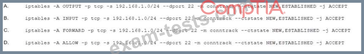 A systems administrator is required to allow only SSH access to the Linux servers from the 192.168.1.0/24 network. Which of the following iptables rules would accomplish this requirement?