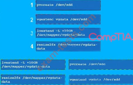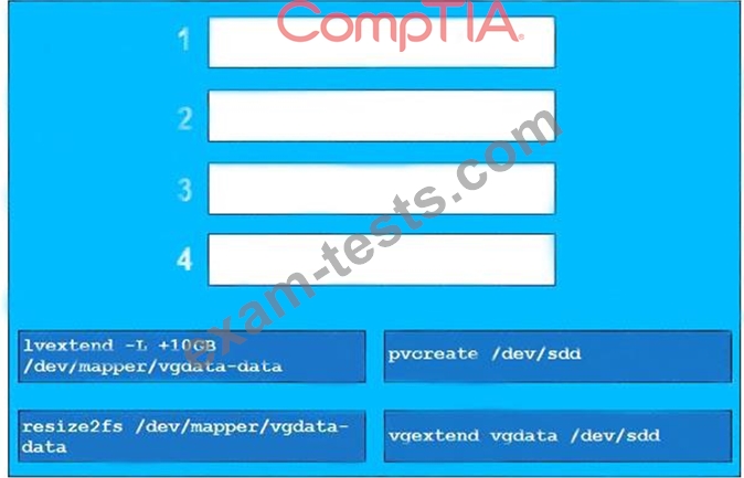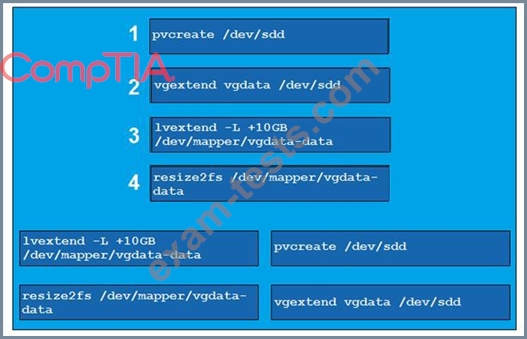 The lead Linux has added a disk, /dev/sdd, to a VM that is running out of disk space. Place the following steps in the correct order from first (1) to last (4) to add the disk to the existing LVM.