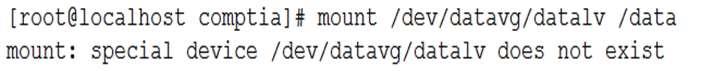 An administrator is troubleshooting an application that has failed to start after the server was rebooted. Noticing the data volume is not mounted, the administrator attempts to mount it and receives this error: